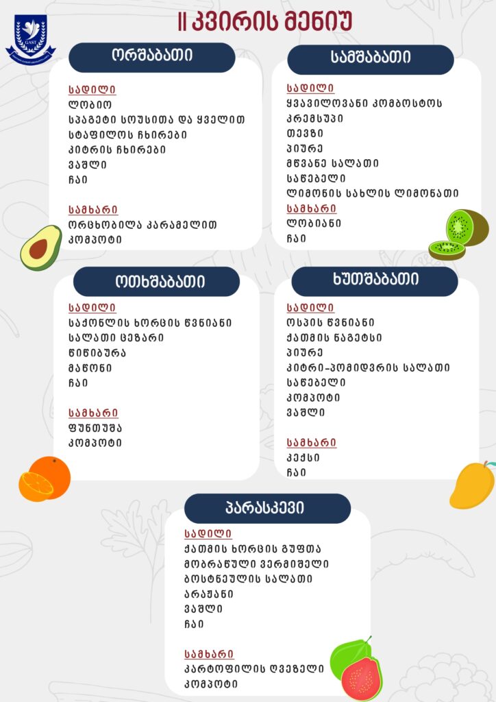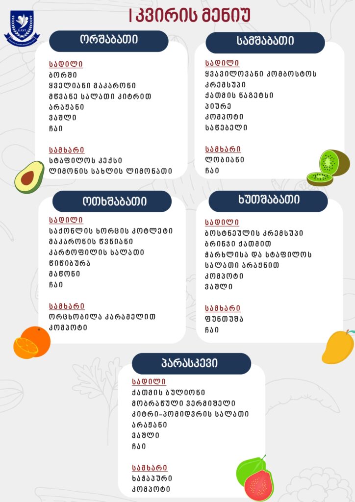 თბილისის ქართულ-ამერიკულ სკოლაში მოსწავლეთა კვებას განსაკუთრებული ყურადღება ეთმობა. სკოლაში ფუნქციონირებს თანამედროვე სტანდარტების შესაბამისი სასადილო, სადაც ჯანსაღი პროდუქტისგან ადგილზე მზადდება საკვები. სამზარეულოსა და სასადილოში დაცულია ყველა ჰიგიენურ-სანიტარული ნორმა. მენიუს ადგენს და მუდმივად აკონტროლდებს სკოლის ექიმი.