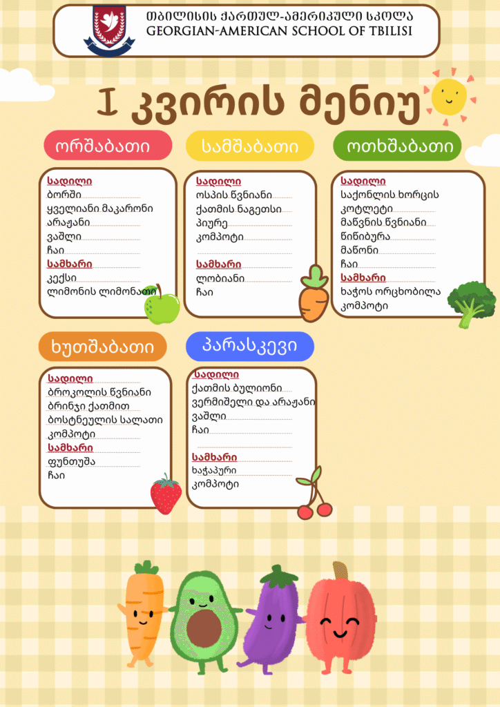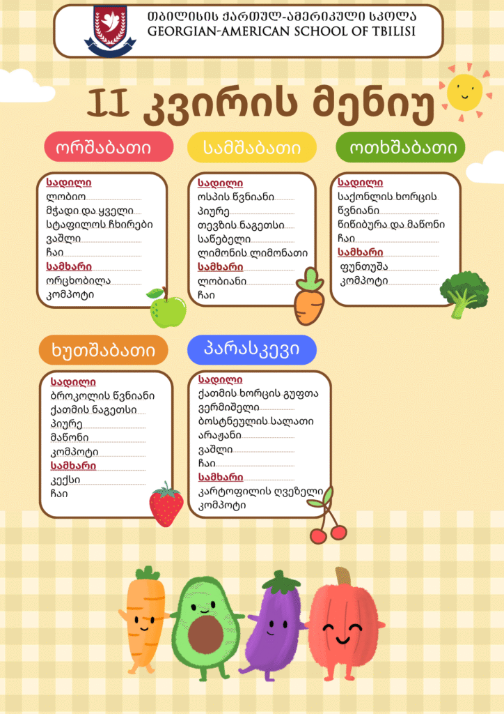 At the Georgian-American School of Tbilisi, special attention is paid to the nutrition of students. The school has a canteen designed in accordance with modern standards, where food is prepared fresh on the spot from healthy products. All hygienic and sanitary standards are observed in the kitchen and the dining room. The menu is developed and constantly monitored by the school doctor.